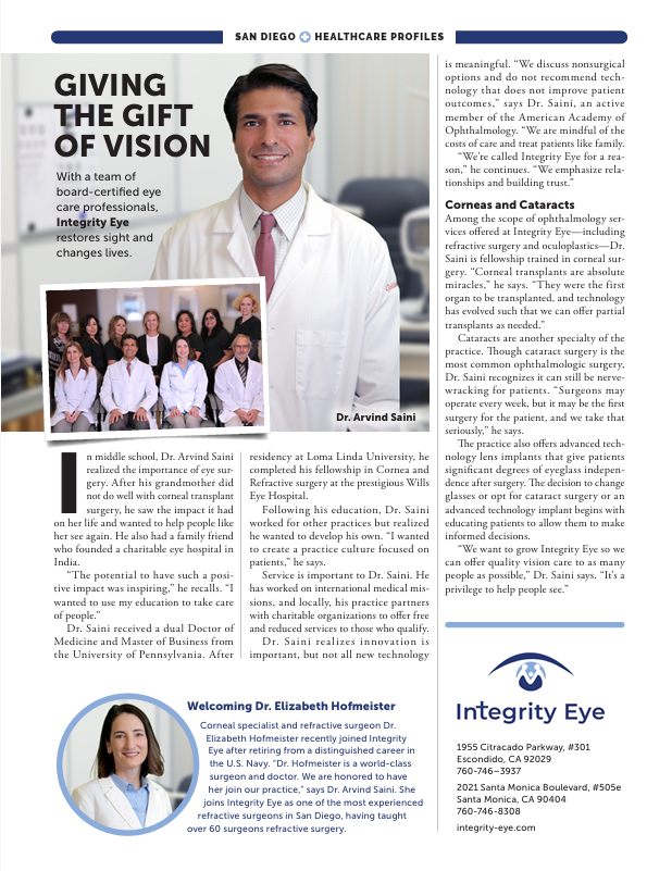 Integrity Eye’s roots date back to Hidden Valley Eye Associates, which was founded by Howard Krausz MD, PhD in North County San Diego over 40 years ago. Arvind Saini MD, MBA, who shared a similar care philosophy as Dr. Krausz, then purchased Hidden Valley Eye. Our practice has evolved by adding locations, new team members, and new doctors. There has been a lot of ups and downs on the way (think COVID, and plenty of other things). There has been lots of hard work, risk and sacrifice to build, design, and move into our offices. There certainly have been growing pains as we have refined our process, but we did this to create the type of practice we believe in. We have not forgotten our principles of providing the highest quality, honest, patient centered care. We provide comprehensive eyecare for conditions such as glaucoma, diabetes, and macular degeneration. We are leaders in cataract surgery and other advanced surgeries such as corneal transplants, corneal cross linking, and refractive surgery. Our goal is to be a place where patients can get clear, honest information about their eye health and surgical options—without pressure, confusion, or hidden financial motives. We only make diagnostic and treatment recommendations based on accepted standards of care, not anticipated insurance or patient payments. We try to communicate patients out of pocket expenses with their insurance before their visits. We do not send shockingly inflated bills to our uninsured patients, rather we charge what we expect to be paid by insurance. We don’t sell glasses to patient’s who won’t benefit from them, or recommend surgery when its not time. We try to prescribe medications with good insurance coverage as first line agents. We simply aim to provide care with quality, fairness, clarity, and compassion.